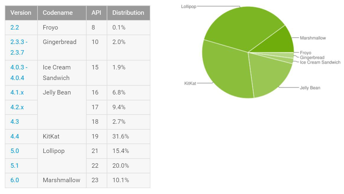 Android Marshmallow ist jetzt schon knapp ein Dreivierteljahr alt und wird bald von Android N abgelöst. Doch noch immer ist die Verteilung der sechsten Generation mehr oder weniger unter aller Kanone. Erst jedes zehnte Android-Gerät kommt mit Android Marshmallow daher. 10,1 Prozent sind es, um genau zu sein. Immerhin konnte das Betriebssystem zum Vormonat etwas mehr als 2,5 Prozent zulegen. Im Vergleich von iOS ist das jedoch lange nichts – innerhalb von drei Monaten hat sich iOS 9 auf 70 Prozent aller Geräte durchgesetzt.