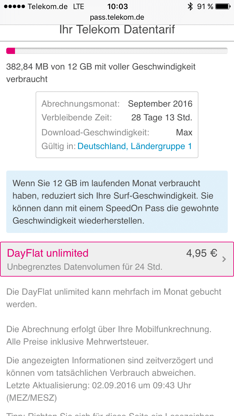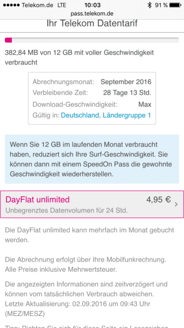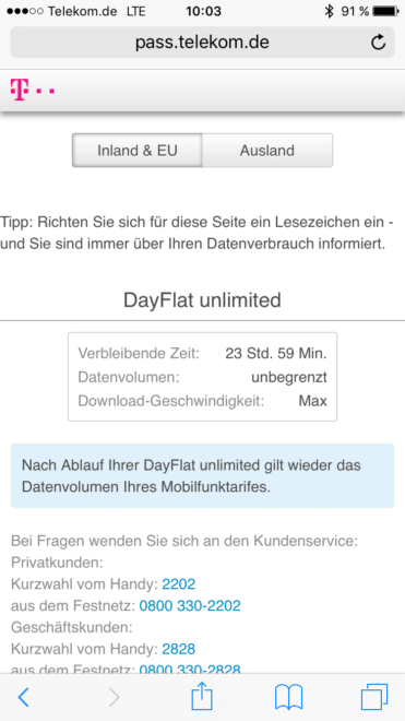 Viele Mobilfunkkunden der Telekom durften sich bereits gestern darüber freuen, künftig mit der schnellsten LTE Geschwindigkeit surfen zu können. LTE Max war bislang nur manchen Kunden vorbehalten. Seit gestern können alle LTE Kunden mit maximal 300 Mbit/s surfen. Sogar Prepaid-Kunden werden von der neuen Geschwindigkeit abgedeckt. Darüberhinaus gibt es ab sofort eine DayFlat Unlimited. Für 4,95 Euro pro Tag kann der Kunde von einem unlimitierten Datenvolumen profitieren. Nachdem das Paket gebucht wurde, kann der Nutzer genau 24 Stunden lang so viel surfen, wie er möchte. Sobald die DayFlat abgelaufen ist, wird wieder auf das gewohnte Datenvolumen zurückgegriffen. Obwohl viele MagentaKunden eine EU-Flat besitzen, kann die DayFlat nicht ins Ausland mitgenommen werden. Nur in Deutschland kann das unbegrenzte Angebot bei Bedarf gebucht werden. Auch die alten Delta Comfort Tarife können die DayFlat buchen. Hier fallen allerdings stolze 9,95 Euro pro Tag an.