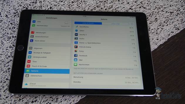 Neues iPad, besserer Akku – von wegen. Das neue iPad Pro 9,7 Zoll besitzt den Akku des iPad Air 2. Obwohl das neue iPad Pro einen deutlich besseren Prozessor hat sollen weiterhin Laufzeiten von bis zu zehn Stunden im Mischbetrieb erreicht werden. Einen abschließendes Akkuurteil kann ich aktuell aber noch nicht fällen. Heute habe ich das Gerät nun schon vier Tage und muss es schon ein zweites Mal laden. Mit dem iPad Air 2 komme ich im Standard eine Woche über die Runden. Der Vergleich ist jetzt aber alles andere als Fair: da ich das iPad auf Herz und Nieren getestet habe, sind die Werte sicherlich akzeptabel. Wie sich der Akkumulator letzen Endes schlägt, lässt sich ohnehin nur im Langzeittest sagen.