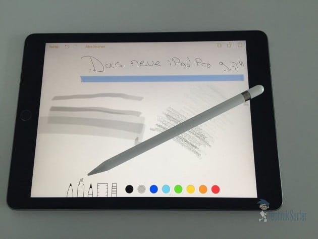 Der Apple Pencil ist – auch wenn dieser satte 109 Euro extra kostet – ebenfalls ein wichtiger Bestandteil des iPad Pros. Mit dem digitalen Bleistift soll der Nutzer wie auf Papier schreiben können. Mit einem Drucksensor werden 256 Druckstärken erkannt. Ganz wie auf Papier ist es dann doch nicht. Der Stift erkennt den Druck präzise und je nach App verändert sich das Stiftverhalten wenn der Stift schräger gehalten wird. Mit einem Bleistift kann so beispielsweise schraffiert und mit einem Textmarker dicker markiert werden. Im Gegensatz zu anderen Stiften kann mit dem Apple Pencil wirklich präzise und sauber geschrieben werden. Mit der Zeit gewöhnt man sich ziemlich schnell daran, auch wenn die Schrift teilweise leiden muss. Das Geschriebene erscheint fast ohne Verzögerungen auf dem Display. Der Apple Pencil kann nicht nur über ein Lightning Kabel, sondern auch über das iPad geladen werden. Dazu kann dieser direkt mit dem Ende eingesteckt werden. Wer auf ein Kabel zurückgreifen möchte, der muss zu dem Adapter greifen, welcher schnell verloren gehen kann. Ein großer Nachteil: jedes Mal wenn Bluetooth am iPad ausgeschaltet war muss der Stift zum Koppeln erneut in das iPad gesteckt werden. Hier leidet auf lange Zeit sicherlich der Akku. Bluetooth einfach eingeschaltet lassen ist ebenfalls keine Lösung, da der Akku des Apple Pencil auch ohne Schreibaufwand in die Knie geht.