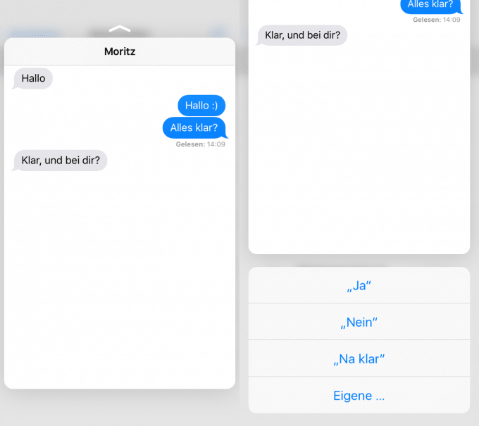 Innerhalb von Apps ist Peek and Pop ein tolles Feature. Hierbei handelt es sich um eine Art Vorschau. Wenn der Nutzer beispielsweise fester auf eine E-Mail drückt, wird diese in einer Vorschau geöffnet. Soll die Mail komplett geöffnet werden, muss noch fester geklickt werden. Und schon öffnet sich die E-Mail. Weiterhin steht natürlich die normale Druckstärke zur Verfügung. Mit dieser wird die E-Mail sofort geöffnet. Peek and Pop öffnet nicht nur E-Mails in einer Vorschau, sondern auch Bilder, Nachrichten und mehr. Sogar Links können geöffnet werden, ohne den Browser zu benutzen. Wird die Vorschau nach oben geschoben, werden dem Nutzer weitere Möglichkeiten gegeben. Nachrichten können mit vorgegebenen Sätzen beantwortet werden, bei Internetseiten kann eine Erinnerung gestellt werden. Dank Siri ist das iPhone 6s intelligent: beim Beantworten der Nachrichten werden immer passende Vorschläge gemacht. Ein Beispiel findet ihr in diesem Bild.