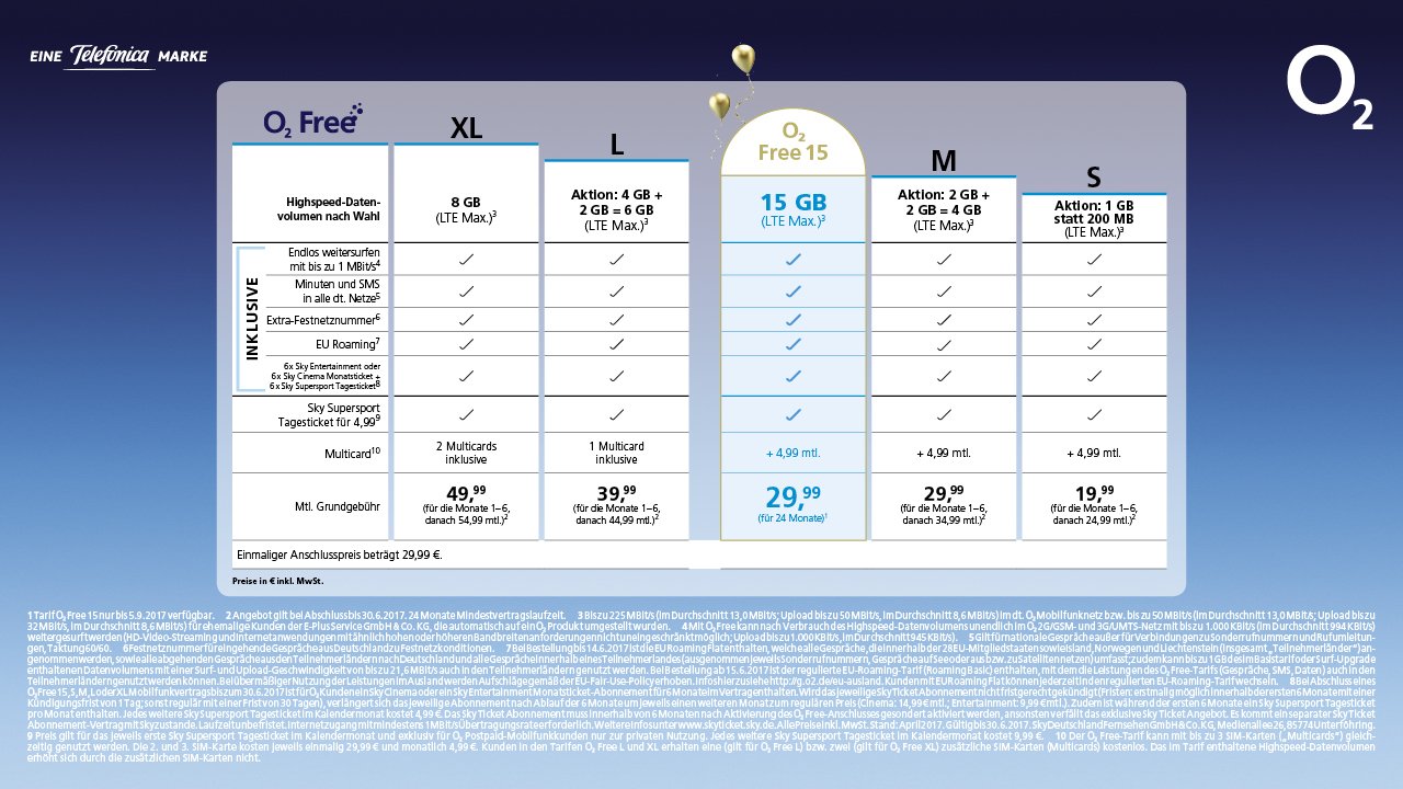 Der Tarif O2 Free 15 wurde speziell für die Jubiläumsaktion erschaffen und bringt, statt den normalen 2 GB (aktionsbedingt 4 GB) des O2 Free M, stattliche 15 GB an Volumen mit. Enthalten sind wie schon beim kleineren Tarif eine Pauschale für Telefongespräche und SMS-Nachrichten, eine Festnetznummer, die Inhalte aus der aktuellen Sky- Aktion, sowie EU-Roaming. Letzteres ermöglicht das fast grenzenlose Kommunizieren innerhalb der Europäischen Union, nur beim Volumen muss der Nutzer Abstriche machen, da es nur 1 GB zum Versurfen gibt.
