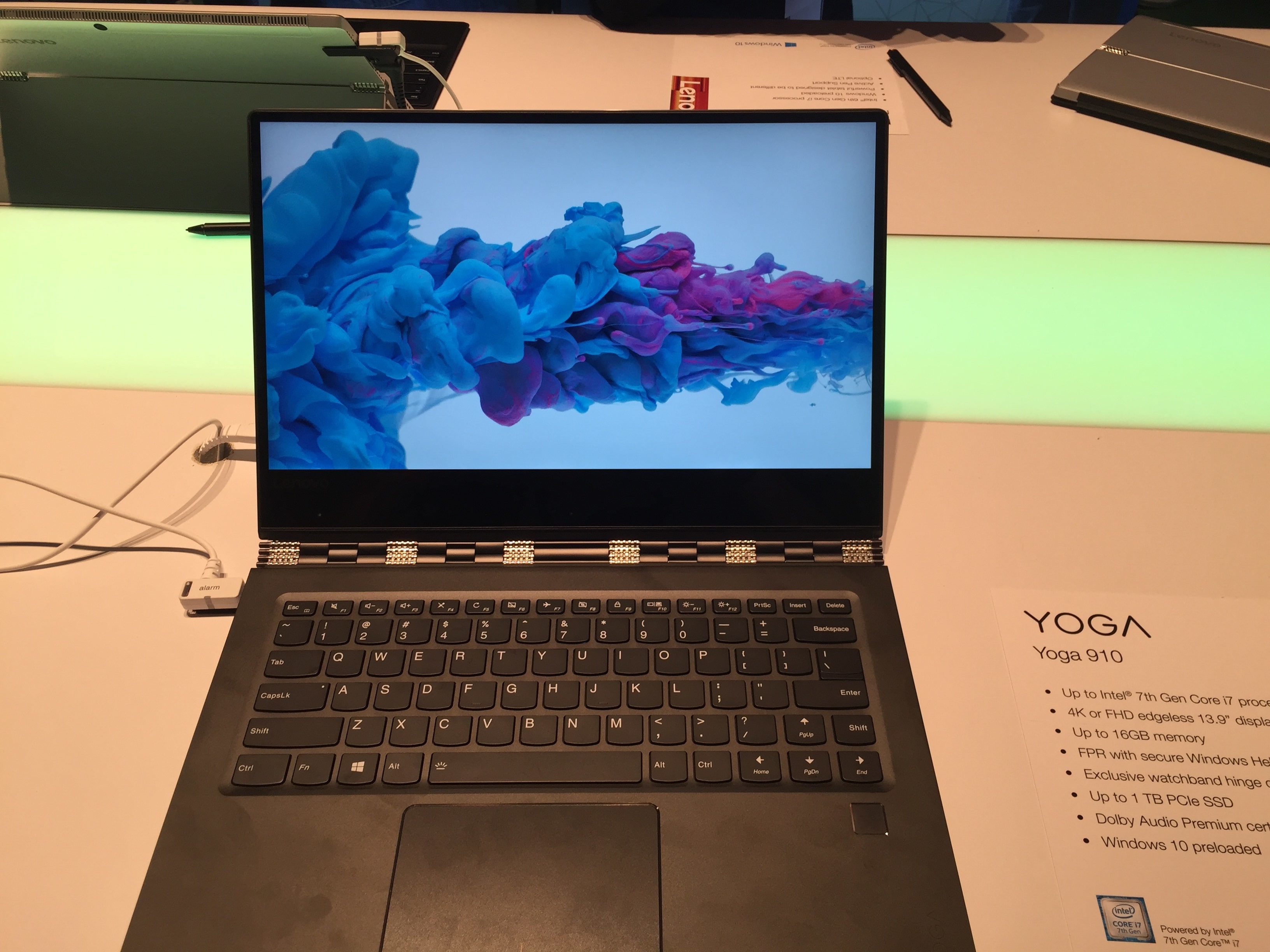 Bei dem heutigen Lenovo Launch hat der Hersteller unter anderem sein neues Convertible Flaggschiff vorgestellt, das Lenovo Yoga 910. Es besteht aus einem Unibodyrahmen  und weiss vor allem durch sein fast rahmenloses Design zu überzeugen. Im Gegensatz zum Vorgänger wurde diesmal ein 4K-IPS Display verbaut, allerdings kann dieses zu Stromsparzwecken auch im FHD-IPS Modus verwendet werden. Der Displayrahmen wurde fast vollständig beseitigt. Lediglich der untere Rahmen ist noch deutlich sichtbar, alle anderen Seiten weisen eine fast schwellenlosen Übergang zwischen Display und Realität auf. Dazu wurde ein 13,9 Zoll Display anstatt eines 13,3 Zoll Displays eingebaut, bei gleichbeliebender Gehäusegröße. Natürlich wurde hier auch einer der neuen Intel Prozessoren der siebten Generation verbaut. Ein Highlight, erstmals wurde außerhalb der Thinkpad Serie ein Fingerabdrucksensor verbaut.