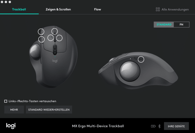 Der neue Präzisionsmodus ist wirklich goldwert. Wird die Taste über der Kugel des Logitech MX Ergo kurz gedrückt, verringert sich die Geschwindigkeit des Cursors deutlich. So kann der Nutzer etwa in Zeichenprogrammen wesentlich feinfühliger arbeiten. Der Präzisionsmodus bleibt so lange aktiv, bis die Taste abermals gedrückt wird. Wer dieses Feature nicht nutzen oder es lieber über eine andere Taste auslösen möchte, braucht sich nur kurz mit der neuen Logitech Options Software auseinanderzusetzen. Hier können alle Tasten komplett umgelegt werden und auch verschiedenste Aktionen zugewiesen werden.