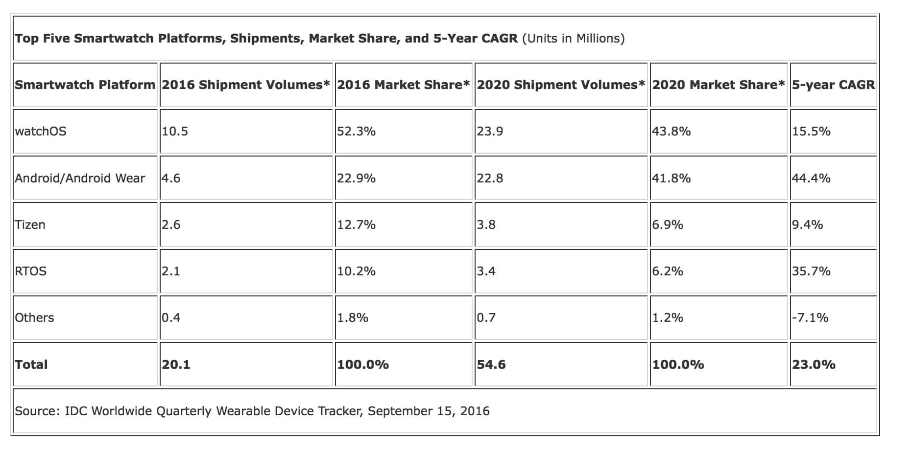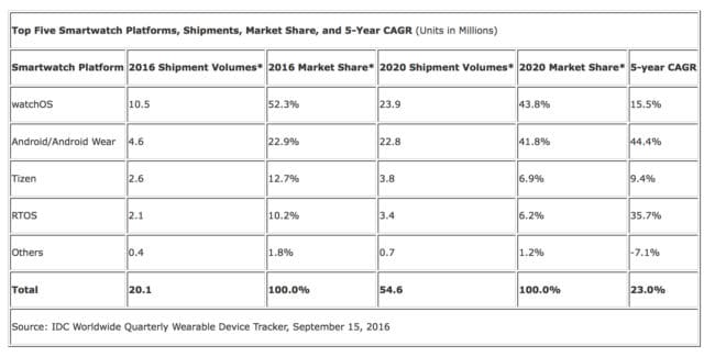 Obwohl Apple immer mehr Geräte verkaufen wird, sinkt der Marktanteil bis 2020 dennoch auf 44 Prozent. Grund: laut IDC wird Android Wear seinen Marktanteil auf 42 Prozent ausbauen können. Aktuell beträgt der Anteil knapp die Hälfte. TizenOS von Samsung geht hingegen in die Knie. Das hauseigene Betriebssystem soll künftig an Beliebtheit verlieren, weshalb der Marktanteil von 13 auf sieben Prozent absinken soll.