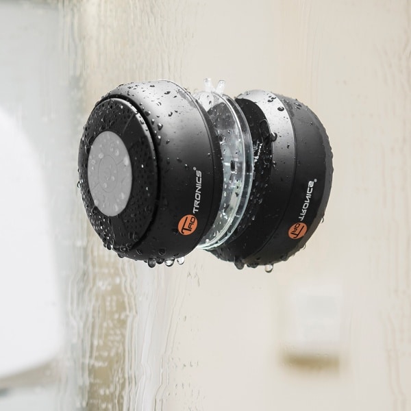 Der Lautsprecher der Firma TaoTronics ist Spritzwasser abweisend und kann somit in der Dusche verwendet werden. Der Lautsprecher wird per Bluetooth mit dem Gerät verbunden.Die Knöpfe des Bluetoothlautsprechers zum Bedienen, auch unter der Dusche, bieten die Möglichkeit, das Gerät ohne Problem zu Steuern. Die Knöpfe sind für den sicheren Betrieb unter der Dusche mit einer Art Silikon umwickelt. Somit lassen sich die Buttons super mit nassen Händen drücken. Unter anderem bietet der Bluetoothlautsprecher auch noch die Funktion, Personen aus der Dusche aus anzurufen.