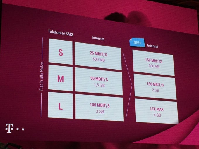 An dem einjährigen Geburtstag von dem MagentaEINS-Tarif wurde dieser in der bereits vierten Generation geupdated. Seit diesem Monat kann dieser im Übrigen 1,5 Millionen Kunden verzeichnen. Neben Speed stand vor allem das Datenvolumen im Vordergrund. Die MagentaMobil Tarife erhalten die Speed- und Volumenupdates, welche bereits am Montagabend bekannt wurden. Während die Mobil S und Mobil M Tarife einen neuen Speed von 150 Mbit/s haben, punktet der Mobil L künftig mit LTE Max, welches Geschwindigkeiten von bis zu 300 Mit/s ermöglicht. Das neue Datenvolumen von MagentaMobil M wird auf zwei Gigabyte, das von MagentaMobil L auf vier Gigabyte gehoben. Der kleinste S-Tarif erhält leider kein neues Datenvolumenpaket, während MagentaMobil L Plus von nun an mit 10 MB dient. Zusatzkosten: keine. Auch Bestandskunden können die überarbeiteten Tarife ab sofort nutzen. Einen weiteren Vorteil bieten die SpeedOn-Pakete, welche das Datenvolumen für einen Monat erhöhen. Diese laufen nicht mehr am Ende des Monats, sondern erst nach 31 Tagen aus. Dabei zählt es nicht, ob dieser zu Beginn oder am Ende eines Monats gebucht wird.