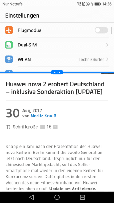 Dank EMUI 5.1 können Apps im Splitscreen dargestellt werden. Dabei lassen sich die beiden geöffneten Apps in ihrer Größe anpassen. Voraussetzung hierfür: Die Application muss mitspielen. Außerdem haben uns die Benutzerrollen gefallen: Wer möchte, kann sogar einen Gast-Account einrichten. Der 2.950 mAh große Akku des Selfie-Superstar reicht im Normalbetrieb für einen Tag. Nach einem Tag muss das Huawei nova 2 wieder an die Dose und per USB-C aufgeladen werden. Im Gegensatz zu manch anderen Herstellern wird auf eine Klinkenbuche nicht verzichtet. Das Mittelklasse-Device liefert einen ordentlichen Klang, für seine Preisklasse ist der Bass akzeptabel. Wer auf ultimativen Sound Wert legt, wird vermutlich etwas enttäuscht sein und sollte notfalls auf externe Lautsprecher oder Kopfhörer zurückgreifen.