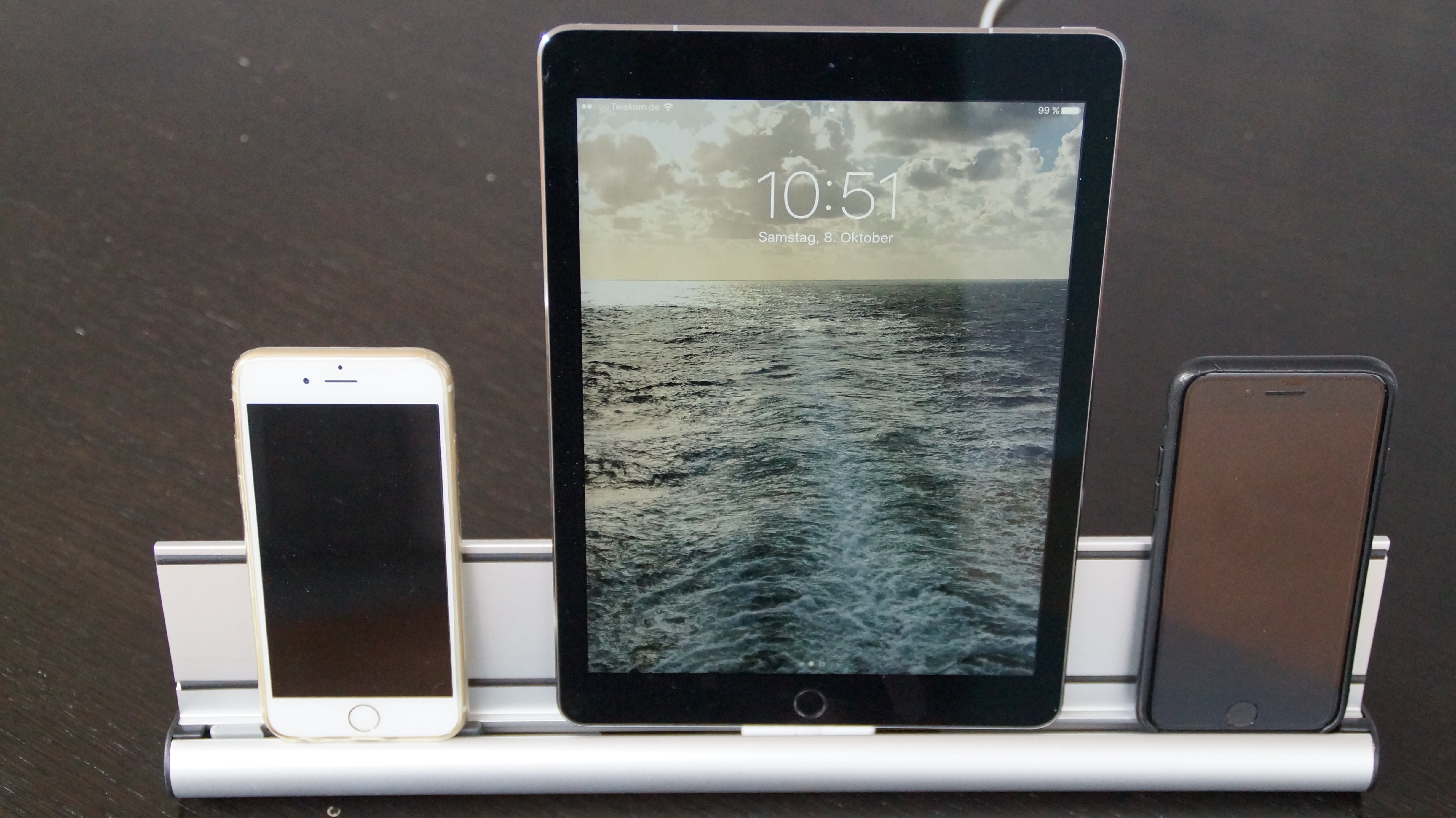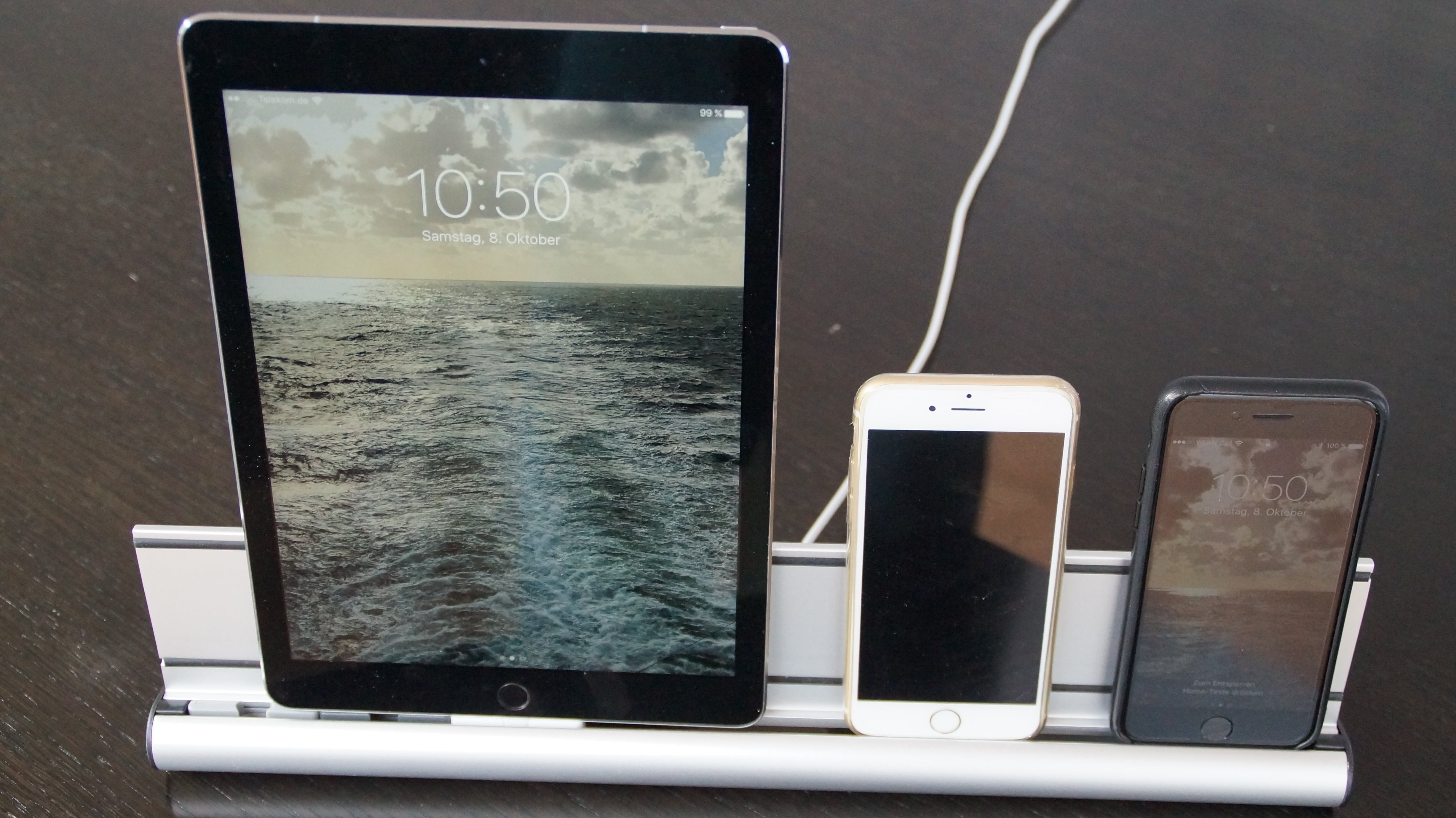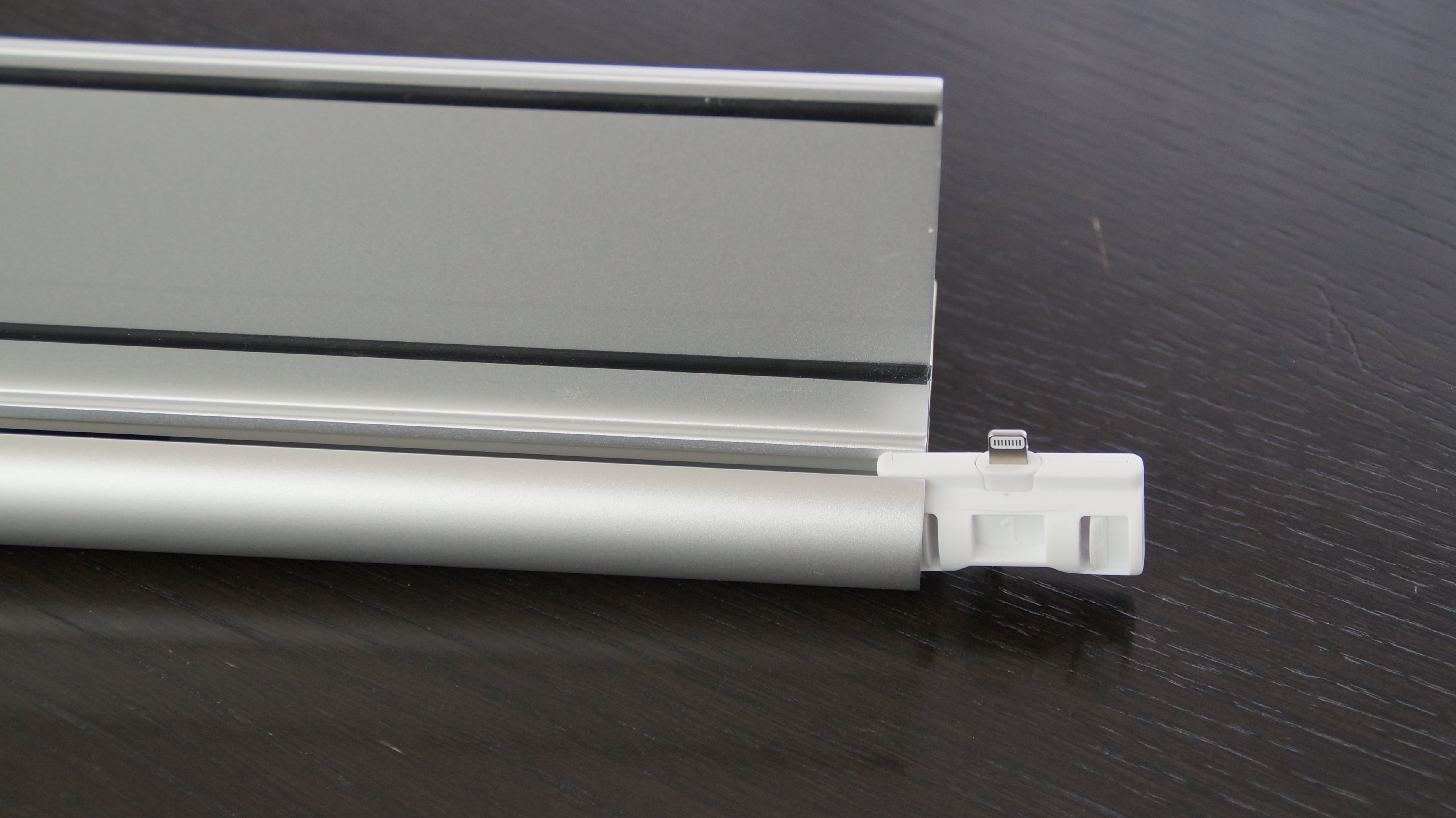 udoq besteht komplett aus Aluminium und kommt in verschiedenen Größen daher. Die Station besteht quasi aus einer Schiene, in welcher die verschiedenen Ladekabel versteckt und untergebracht werden können. Darüber befindet sich eine Art Lippe, an welcher die Geräte angelehnt werden. Diese Lippe besitzt wiederum zwei Gummistreifen, womit Smartphones und Tablets vor Kratzern geschützt werden. Je nach Variante ist udoq 250mm, 400mm, 550mm oder 700mm breit. In dem Onlinekonfigurator kann simpel berechnet werden, welche Größe optimal ist. Der Nutzer gibt unter anderem an, wie viele Smartphones und Tablets die Ladevorrichtung gleichzeitig aufnehmen können soll.