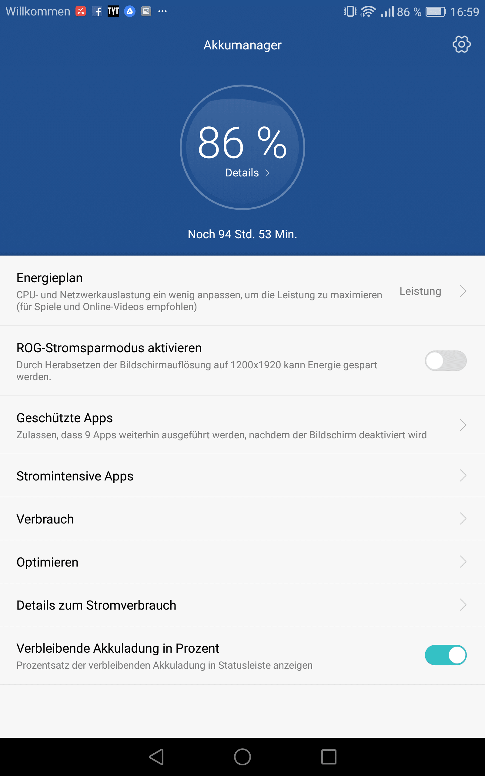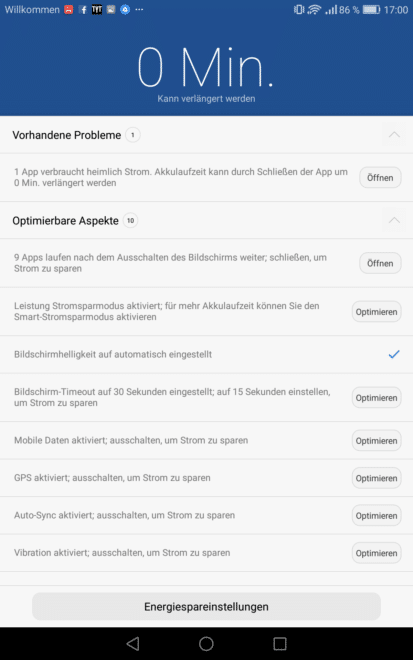 Eine davon ist der Akkumananger, der vielerlei Optionen zum Stromverbrauch anbietet. Neben einem Analyseprogramm, welches die Stromfresser im System herausarbeitet, gibt es auch die Möglichkeit, die Auflösung des Displays herunter zu schrauben und die Prozessorleistung zu beschränken. Ergänzt werden die Optionen mit verschiedenen Energiesparmodi und einem Optimierungsprogramm, welches ungenutzten Speicherplatz wieder frei machen soll. Verwunderlich ist die Tatsache, dass Huawei einen Micro-USB-Anschluss verbaut, obwohl es in anderen Geräten des Hauses bereits Anschlüsse gibt, die auf USB-C-Standard basieren.