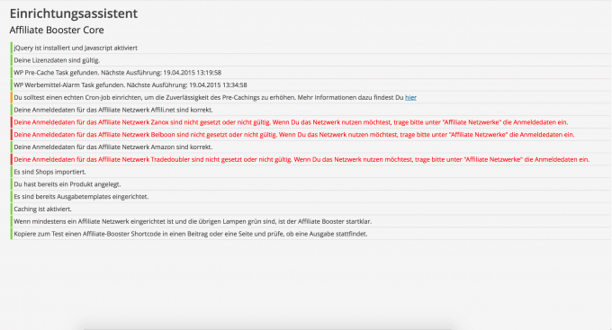 Nach der Installation der Affiliate Booster Plugins öffnet sich automatisch der Einrichtungsassistent. Dieser kann jedoch auch nach der Einrichtung weiterhin aufgerufen werden. Allerdings sollte man dessen Funktion nicht falsch verstehen. Viele verstehen darunter, dass man durch einen Prozess geleitet wird, welcher dann das Plugin mit allen möglichen Einstelungsmöglichkeiten fertig konfiguriert. Dies macht der Assistent von Affiliate Booster jedoch nicht. Dieser zeigt lediglich mit Statusmeldungen an, welche Einstellung noch zu machen ist beziehungsweise schon erledigt wurden, um die Benutzung einwandfrei zu garantieren. Das Design des Assistenten ist wie das restliche Design schlicht und einfach gehalten, allerdings wird in einem Backend auch nicht mehr benötigt. Die Hauptsache ist hier, dass das Backend übersichtlich ist, was hier der Fall ist. Mithilfe von dem Einrichtungsassistenten sieht man auf einen Blick, was noch zu machen ist oder was man noch alles machen kann, um einen guten Betrieb von Affiliate Booster zu gewährleisten.