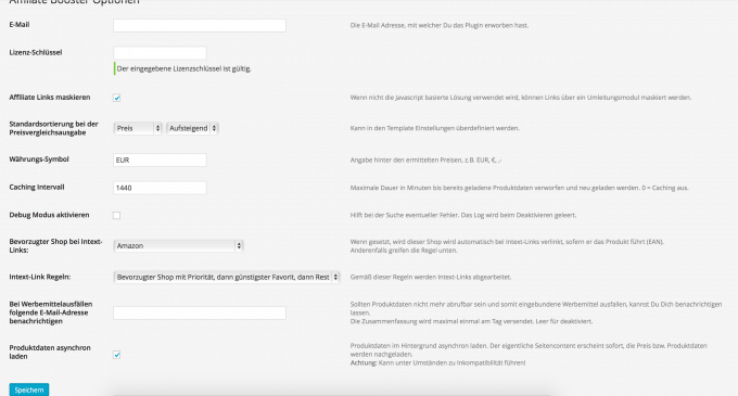 In der Einstellungensektion lassen sich fast alle Funktionen von Affiliate Booster einstellen. Neben grundlegenden Einstellungen wie zum Beispiel die Lizenzinformationen stellt man auch wichtigere Details für das Plugin wie die Währung ein. Mithilfe der Caching-Zeit lässt sich die Ladezeit des Blogs beschleunigen. Dazu werden die Ergebnisse des Vergleiches gespeichert und erst wieder nach der eingestellten Zeit automatische aktualisiert. Damit muss sich das Plugin nicht bei jedem neuen Aufruf mit dem zugehörigen Server der Partnerprogramme verbinden und die Preise abrufen. Außerdem lassen sich die Links maskieren. Hierbei stehen die Methoden über JavaScript oder über eine Linkumleitung zur Verfügung. Damit sollen unschöne Links für die Leser aber auch wegen SEO-Gründen vermieden werden. Sollten Produkte oder Links beziehungsweise ein Werbemittel nicht mehr zur Verfügung stehen, merkt dies Affiliate Booster und kontaktiert den Blogbesitzer. Somit sollen in erster Linie tote Links vermieden werden. Die letzte aber wichtige Einstellung ist das asynchrone Laden des Produktvergleiches. Diese sorgt ebenfalls dazu, dass kein Ladezeitenverlust auftritt. Hierzu werden als erstes die Bloginhalte und im Anschluss die Daten für den Preisvergleich geladen. Dies sorgt bei manchen Designs allerdings für Probleme und Inkompatibilität. Bei uns funktioniert diese Methode allerdings.