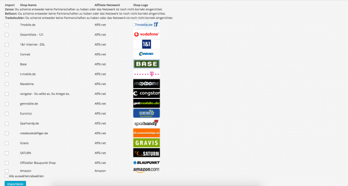 Nachdem man die Netzwerke erfolgreich eingebunden hat, steht nun die Integration der Shops an. Dies ist mit Affiliate Booster jedoch keine Herausforderung. Das Plugin bietet dem Nutzer alle zur Verfügung stehenden Händler an. Hierzu zählt bei der Partnerschaft mit Amazon der Amazon-Shop und bei Affili.net alle Progamme, welche aktiv und angenommen wurden. Eine weitere Voraussetzung ist hierbei, dass der Händler über die Webservices eine CSV-Datei anbietet, aus welcher das Plugin sich die Informationen aus dem Partnerprogramm sowie aus den Produktdaten holen kann. Möchte man einen oder mehrere Shops nun integrieren, wählt man einfach die gewünschten aus und startet den Prozess. Dieser automatische Prozess dauert nur einige Sekunden und integriert alle Shopdaten, wie zum Beispiel den Namen, den Link und das entsprechende Logo. Diese Daten können im Nachhinein selbstverständlich manuell bearbeitet werden.