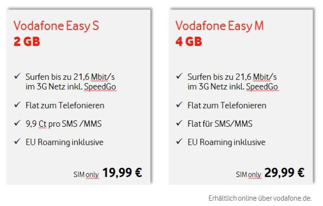 Vodafone Easy S und Vodafone Easy M erweitern ab Dienstag die Tarifpallete von dem britischen Anbieter in Deutschland. Die günstigeren Angebote sollen Kunden anziehen, welche weniger Geld für ihren Smartphone Vertrag ausgeben möchten. Mit 19,99 Euro für Easy S und 29,99 Euro für Easy M sind die Preise zunächst gerechtfertigt. Immerhin bekommt der Kunde zwei beziehungsweise vier GB Datenvolumen spendiert. Außerdem beherbergen beide Tarife eine Telefon-Flat.
