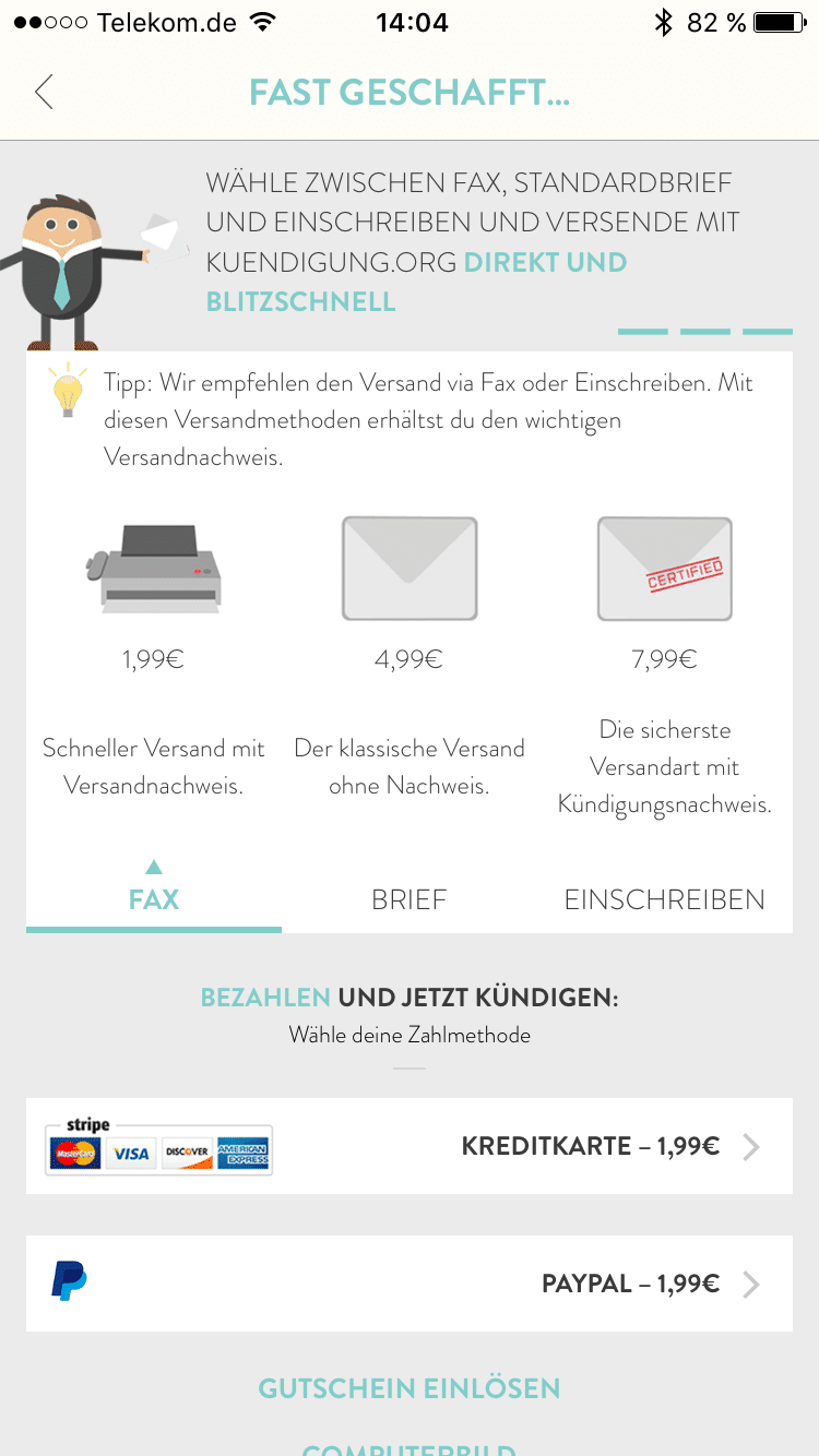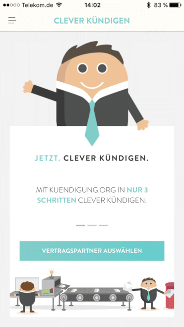 Startups, aber auch größere Unternehmen bedienen sich gerne dieser Taktik. Es wirkt allerdings kleinlich, umständlich und torpediert genau das, was viele Dienste, wie auch kuendigung.org, als Kernkompetenz anpreisen: schnell und einfach eine Aufgabe zu erledigen. Wenn der Nutzer zunächst erst eine App laden soll, ist das ganze Prozedere schon nicht mehr ganz so zügig erledigt. Generell hat der Nutzer die Wahl sich seine Kündigung als PDF herunterzuladen und selbst auf den Weg zu bringen oder sie vom Dienst versenden zu lassen. Man verspricht dabei hohe datenschutzrechtliche Standards einzuhalten und sicherzustellen, dass alle verwendeten Formulare stets rechtlich aktuell und zulässig und die Zustelladressen stets auf dem neuesten Stand sind.