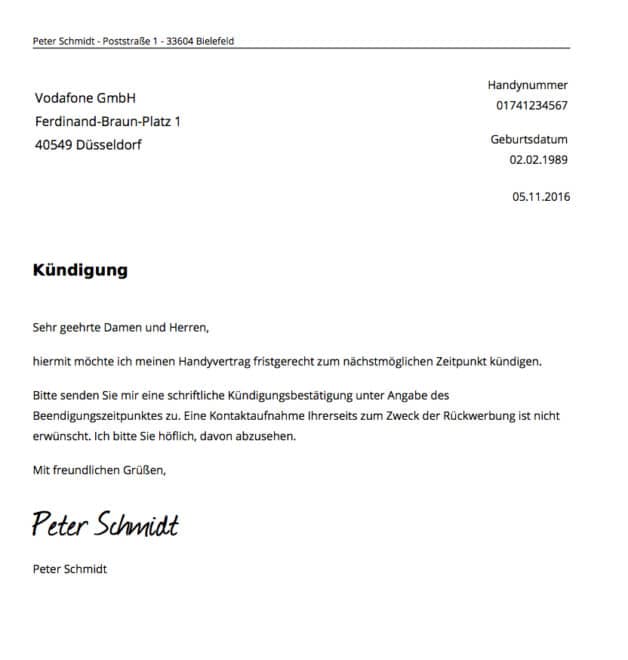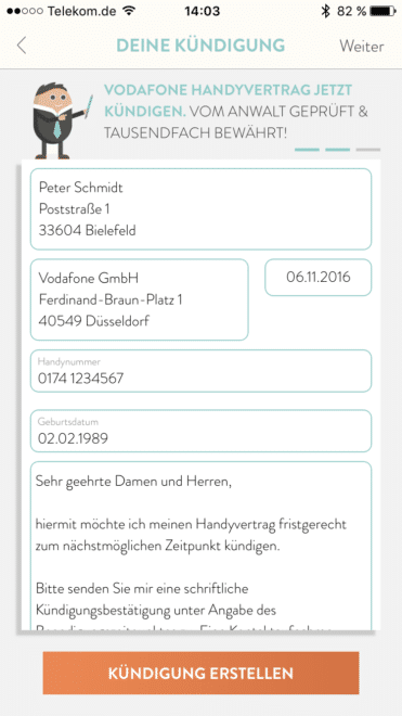 Wir machen kurz die Probe aufs Exempel: beim Klick auf „Vodafone Handyvertrag“ öffnet sich ein Formular. Es fragt Daten zur Person ab, Name, Adresse, Geburtsdatum, Datum der Kündigung und natürlich die betroffene Rufnummer werden abgefragt. In den Brieftext setzt das Portal dann eine kurze Mitteilung.