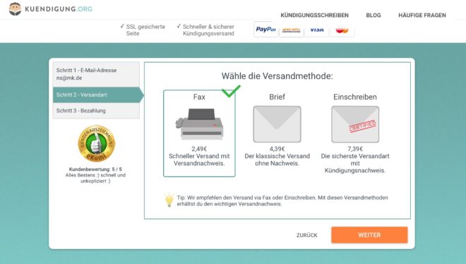 Mit Klick auf „Vodafone-Handyvertrag jetzt kündigen“ gelangt der kündigungswillige Mobilfunknutzer noch zu einer Abfrage seiner E-Mail-Adresse für die Zusendung des Kündigungsnachweises. Dann kann die Kündigung direkt auf den Weg gebracht werden. kuendigung.org arbeitet hier mit einem Partner zusammen und versendet die Kündigung wahlweise per Fax, Brief oder Einschreiben. Hier wird eine zusätzliche Gebühr fällig, über den sich der Dienst finanziert.