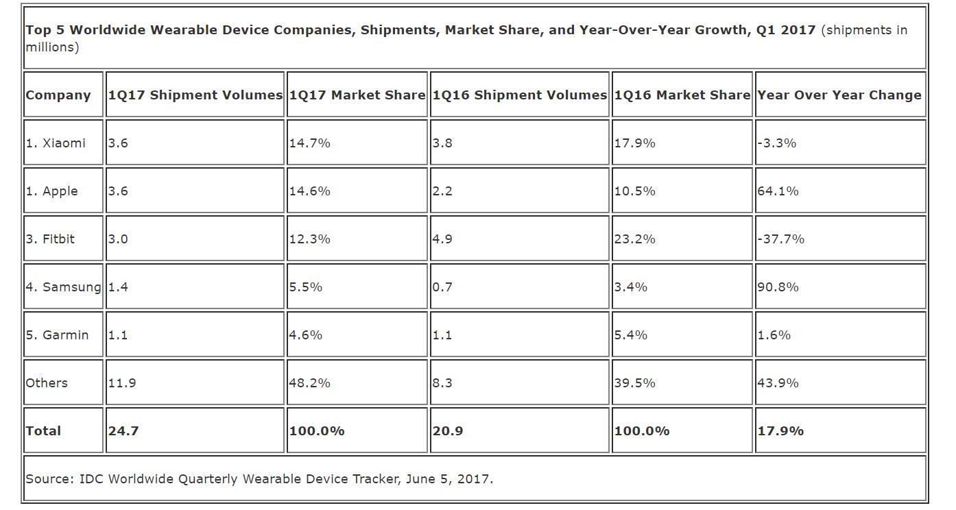 Am meisten freuen dürfte sich aber Samsung, da die Südkoreaner ein Wachstum von 90,8 Prozent für sich beanspruchen dürfen. Lediglich Garmin bleibt hartnäckig und konnte seine Verkaufszahlen stabil halten. Während Garmin dennoch auf den letzten Platz abgerutscht ist, ist Samsung nun für den 5. Platz platziert. Außerdem beweist die Statistiken, dass der Wearable-Markt langsam ins boomen kommt. Die großen Hersteller holen auf, zudem wächst die Nachfrage von 20,9 Einheiten im ersten Quartal 2016 auf 24,7 Millionen Geräte 2017.