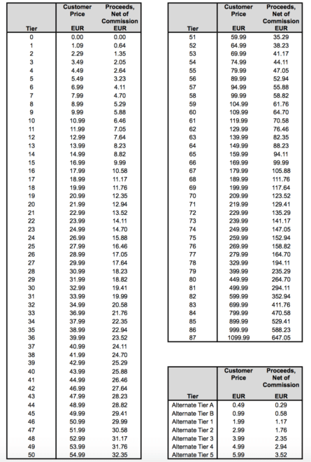 Auf diesem Bild listet Apple komplett alle neuen AppStore Preise auf. Die teuerste App wird künftig für 1.099,99 Euro angeboten. Zudem wird es weiterhin die alternativen Preise von 0,99 Euro, 1,99 Euro bis hin zu 5,99 Euro geben, welche die Entwickler auswählen können. Die Entwickler sind übrigens an die Preiserhöhung gebunden: die Preise erhöhen sich automatisch für alle Apps. Allerdings geht Apple diesmal einen großen Schritt auf die Kunden zu.
