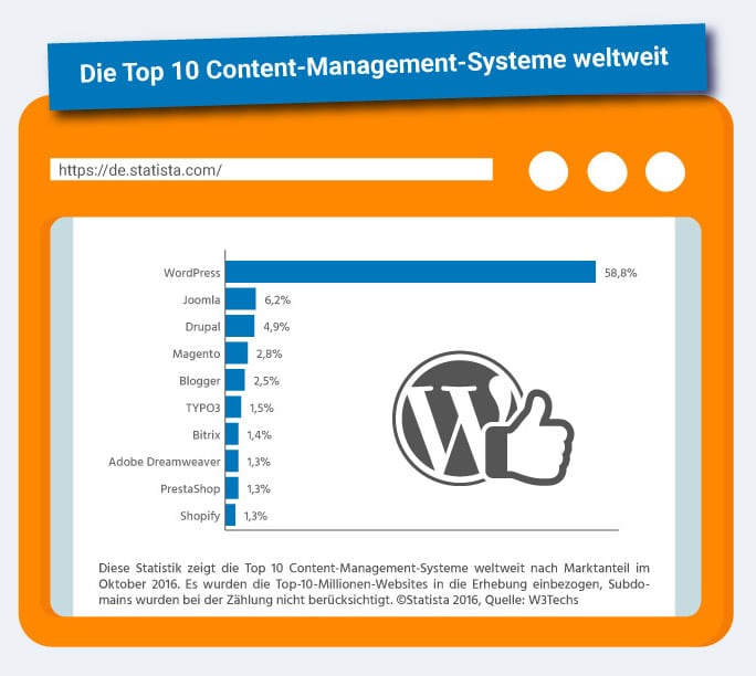 Systeme zur Erstellung und Pflege von Websites gibt es viele, sowohl kostenpflichtige wie RedDot oder Weblication CMS, als auch Open-Source-Lösungen wie WordPress und Joomla!. Allein im August 2016 veröffentlichten die Nutzer von WordPress laut Statistik rund 70 Millionen Blog-Posts. Kein Wunder: Die Erstellung und Pflege von Websites über die Software ist nicht nur kostenlos. Auch die vielfältigen Gestaltungsmöglichkeiten, die selbst Laien leicht erlernen können, die kein CSS oder HTML beherrschen, überzeugen.